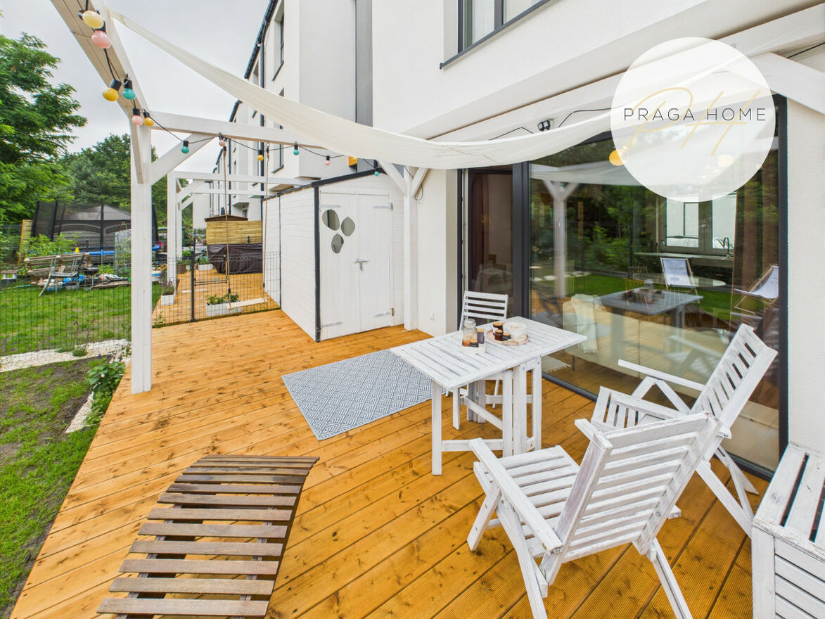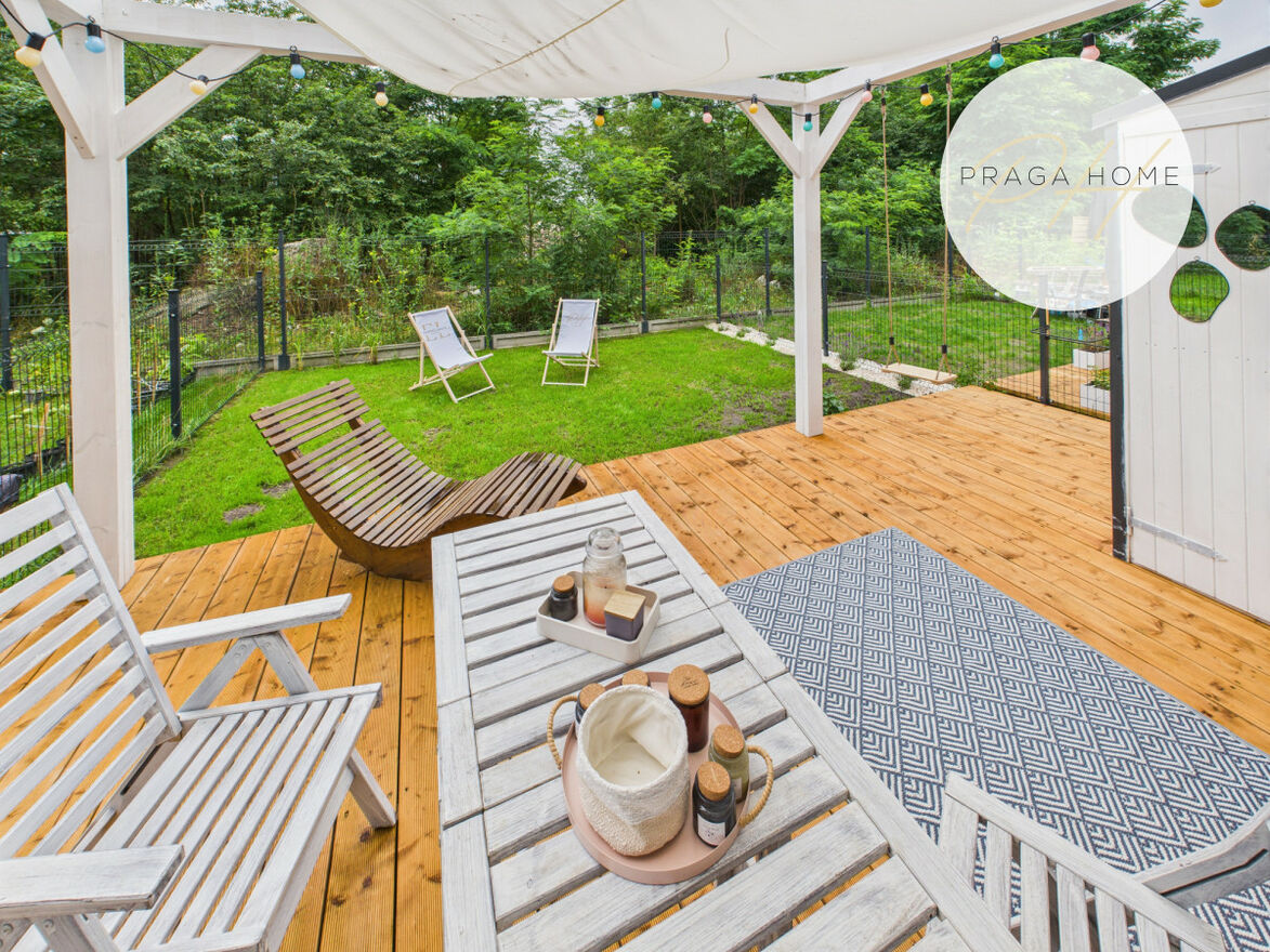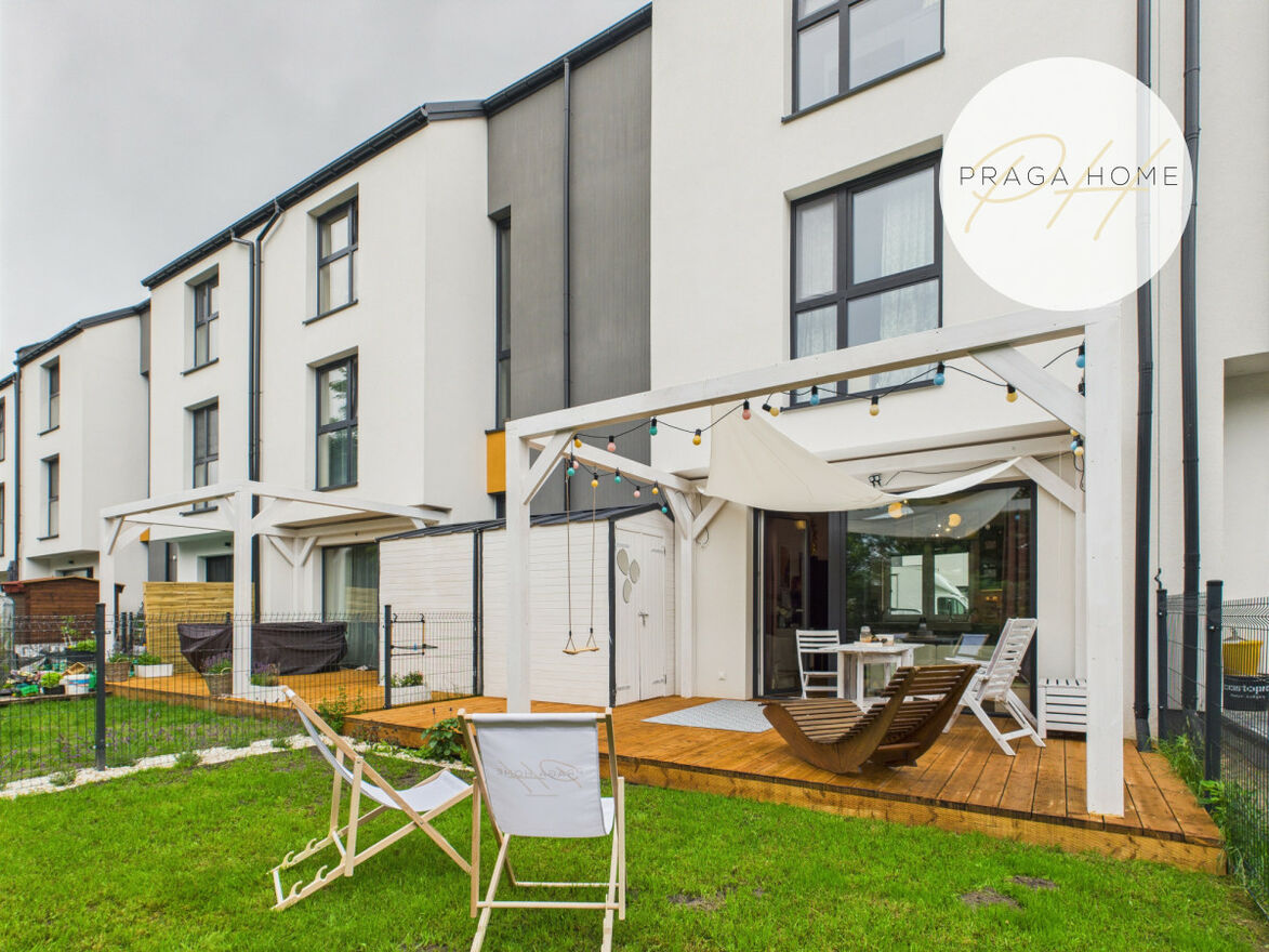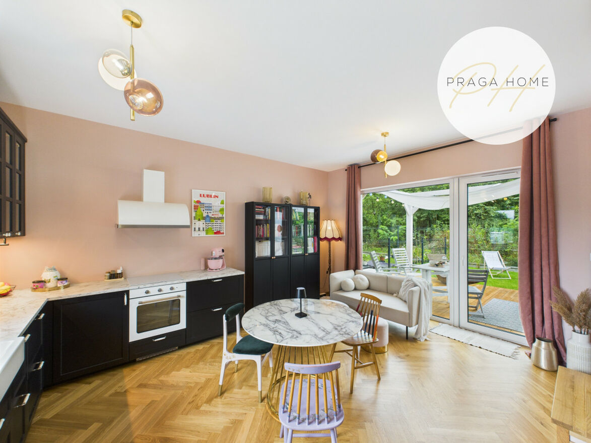 Na parterze znajduje się przestronny salon z dużym, funkcjonalnym aneksem kuchennym. Aneks oferuje dużo miejsca do przechowywania i pracy dla miłośników gotowania. Z salonu prowadzi wyjście na prywatny, ogrodzony ogródek w pełni zaaranżowany, z tarasem i pergolą — idealny do relaksu, grillowania czy zabawy z dziećmi.