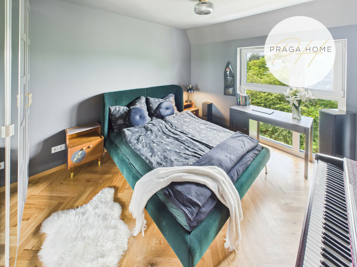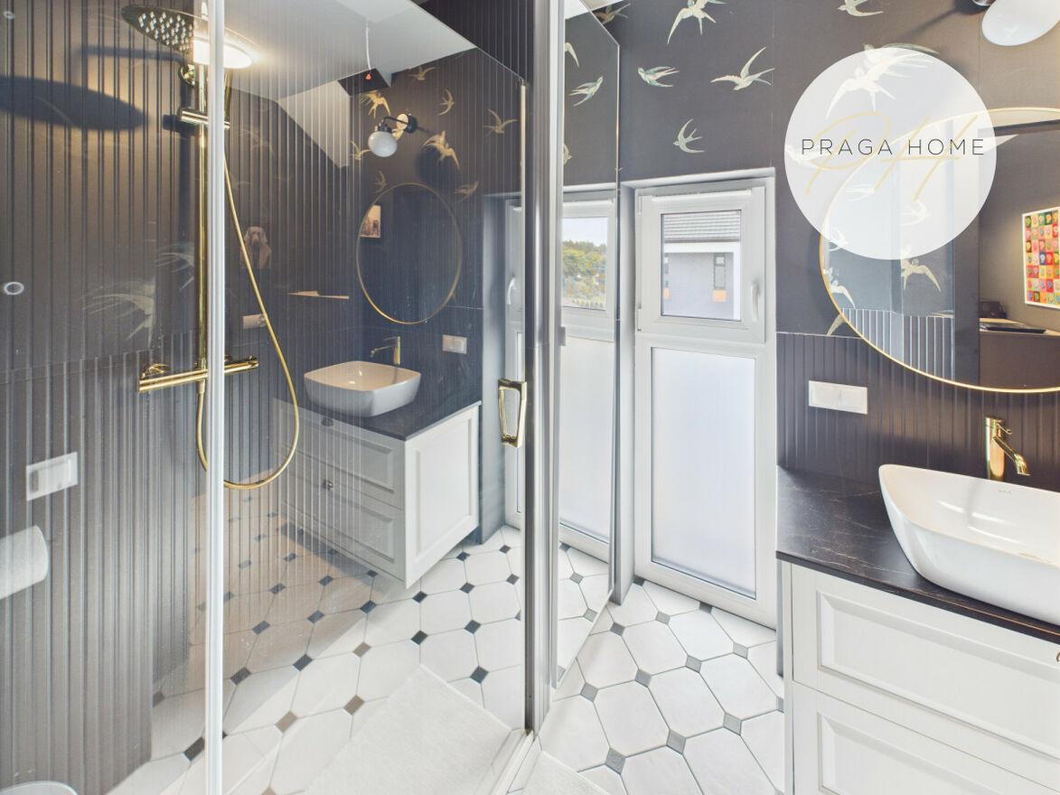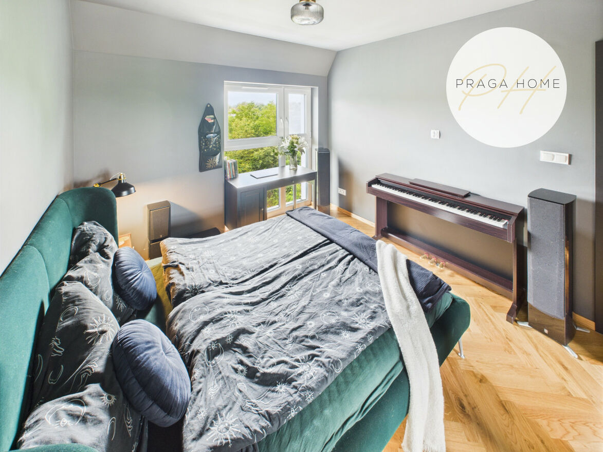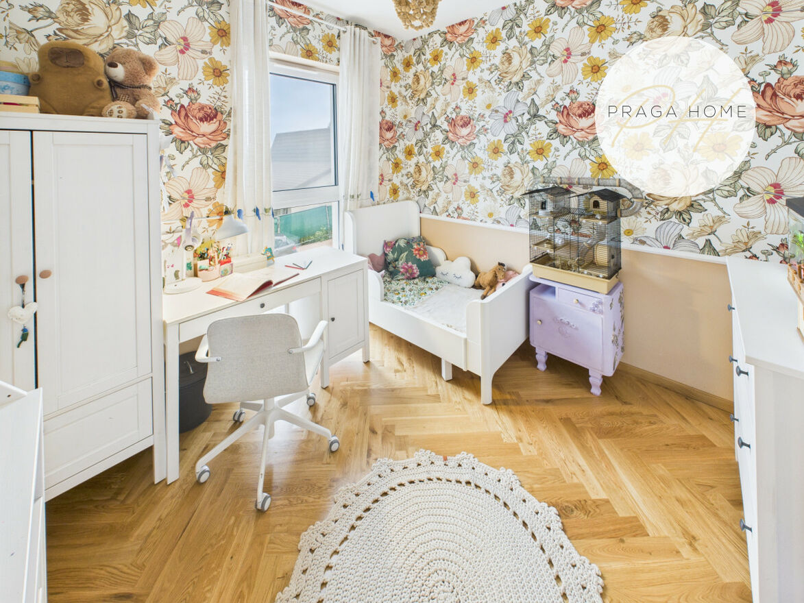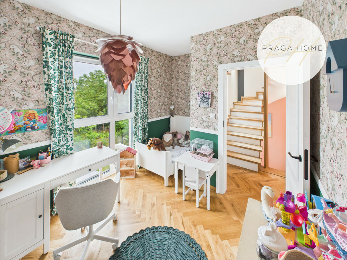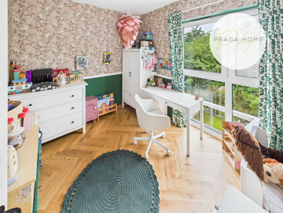 Na pierwszym piętrze rozmieszczono dwa pokoje dziecięce oraz łazienkę. Na drugim natomiast znajduje się przestronna sypialnia z garderobą i łazienką. Takie rozwiązanie sprawia, że dom oferuje trzy oddzielne sypialnie lub pokoje do pracy, co jest rzadkością w tej kategorii nieruchomości. Dodatkowo dostępne jest poddasze, które można zaaranżować według własnych potrzeb (np. jako przestrzeń do przechowywania sezonowych rzeczy). Schody zostały wykonane na wymiar z drewna dębowego.